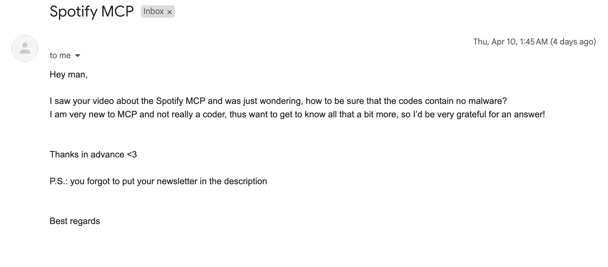 Currently, the MCP space is dominated by developers. The majority of people using MCP servers are the same people that are building MCP servers. They understand how they’re built, and they have a better idea on how to filter out malicious MCPs. However, non-technical people like our subscriber might be excited about using MCPs, but may have concerns about security. The MCP community wants greater user adoption, but security must be addressed to achieve that.